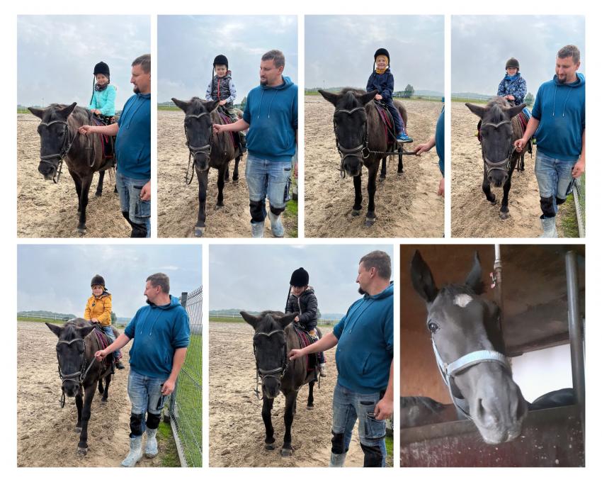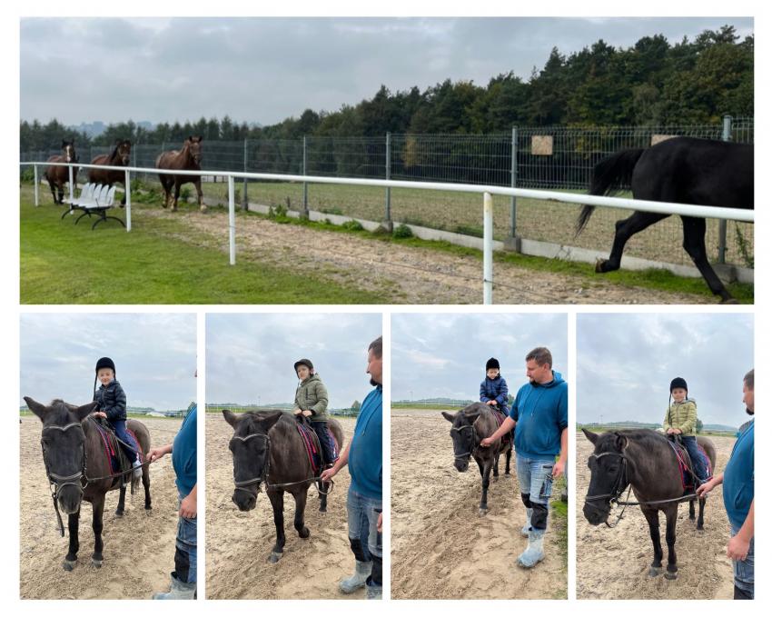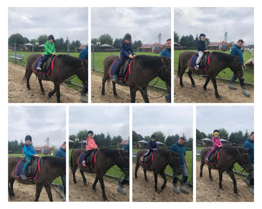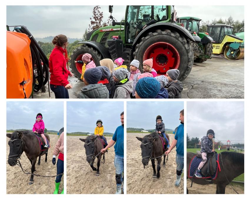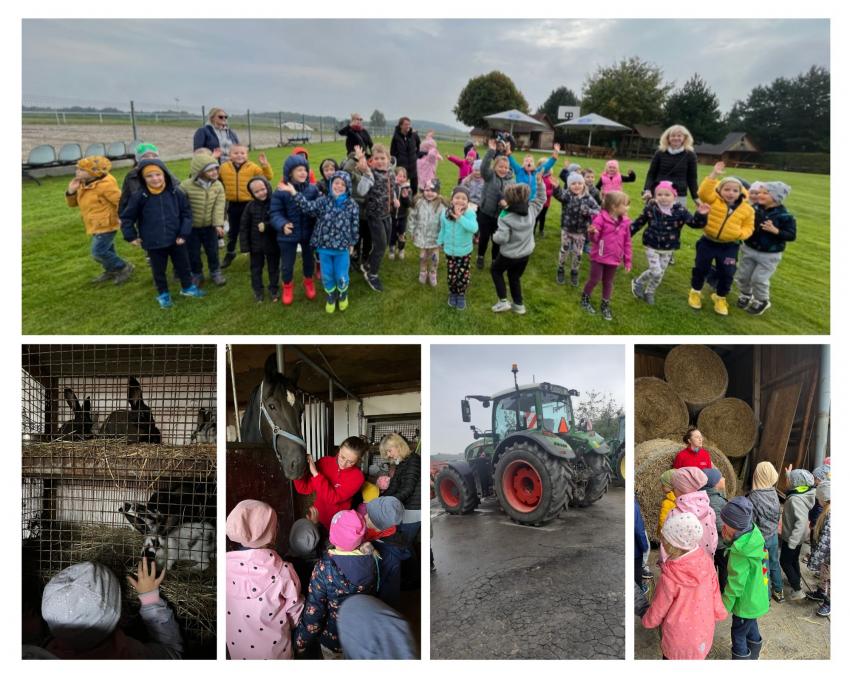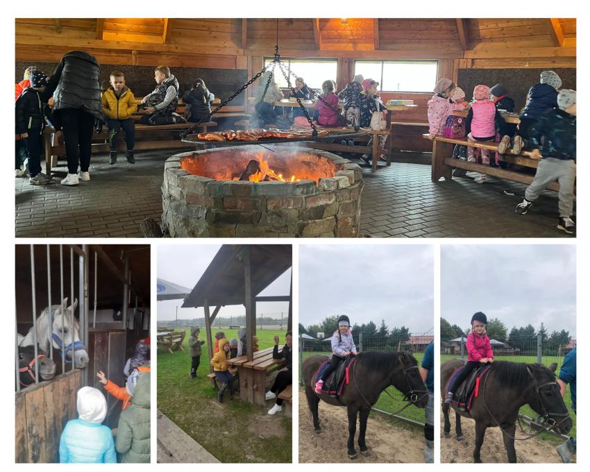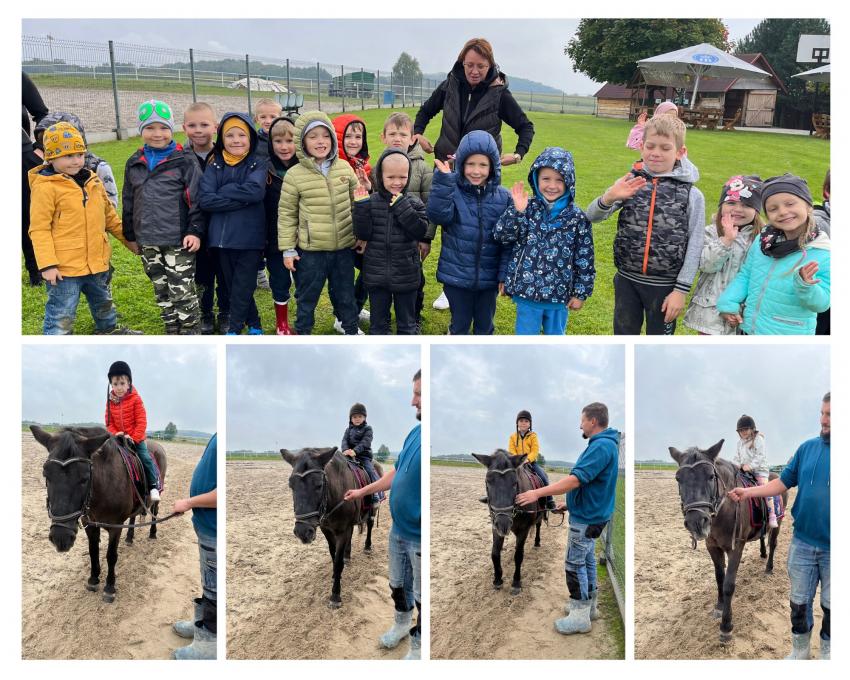 Dnia 26 września nasze przedszkolaki z grupy V Żabki oraz z grupy VI Pszczółki wybrały się na wycieczkę do malowniczo położonego gospodarstwa agroturystycznego Przy Leśniczówce w Czernej. Dzieci swoją przygodę rozpoczęły od spaceru po gospodarstwie, podczas którego oglądały ogromne maszyny rolnicze i poznawały ich przeznaczenie. Jednak największą atrakcję stanowił dla dzieci wesoły zwierzyniec. Na początku Gospodyni oprowadziła nas po stajniach i zapoznała z ich mieszkańcami: łagodnymi konikami i kucykami które można było głaskać, króliczkami o miękkim futerku, wesołym osiołkiem, rozbrykanym byczkiem, krówką i najsłodszym na świecie malutkim cielaczkiem, nie brakowało też kurek i stada owiec. Następnie każdy przedszkolak mógł usiąść w siodle i wyruszyć na krótką przejażdżkę z łagodną klaczą Malwinką. Wreszcie przyszedł czas na odpoczynek - dzieci wypiły ciepłą herbatkę i zjadły pyszne kiełbaski upieczone na ognisku. Na końcu Pan Gospodarz wypuścił wszystkie koniki na pastwisko. Dzieci z zachwytem podziwiały ich galop i zabawy. To była ciekawa wycieczka z mnóstwem atrakcji.