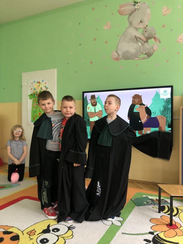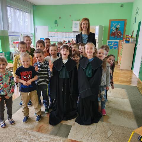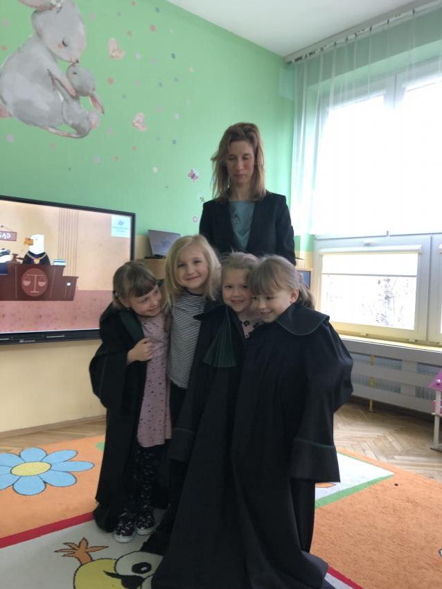 Dnia 12 kwietnia nasze starsze przedszkolaki odwiedziła Pani Adwokat, która w ciekawy sposób opowiedziała dzieciom o swojej pracy, a także pozwoliła przymierzyć prawdziwą adwokacką togę! Piękny prezent - książeczka p.t. LEŚNE SPRAWY MISIA ADWOKATA, będzie nam przypominać to ciekawe spotkanie.
