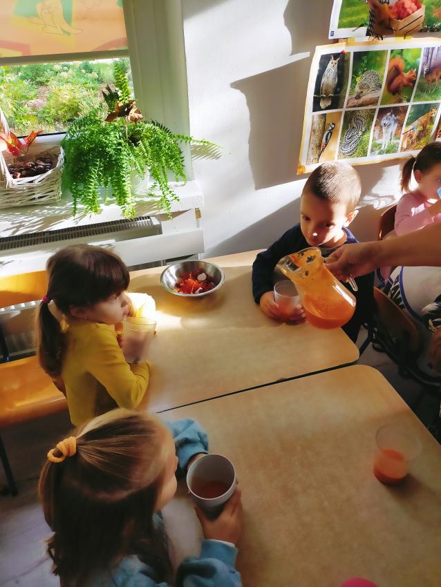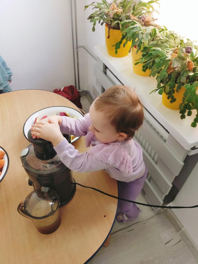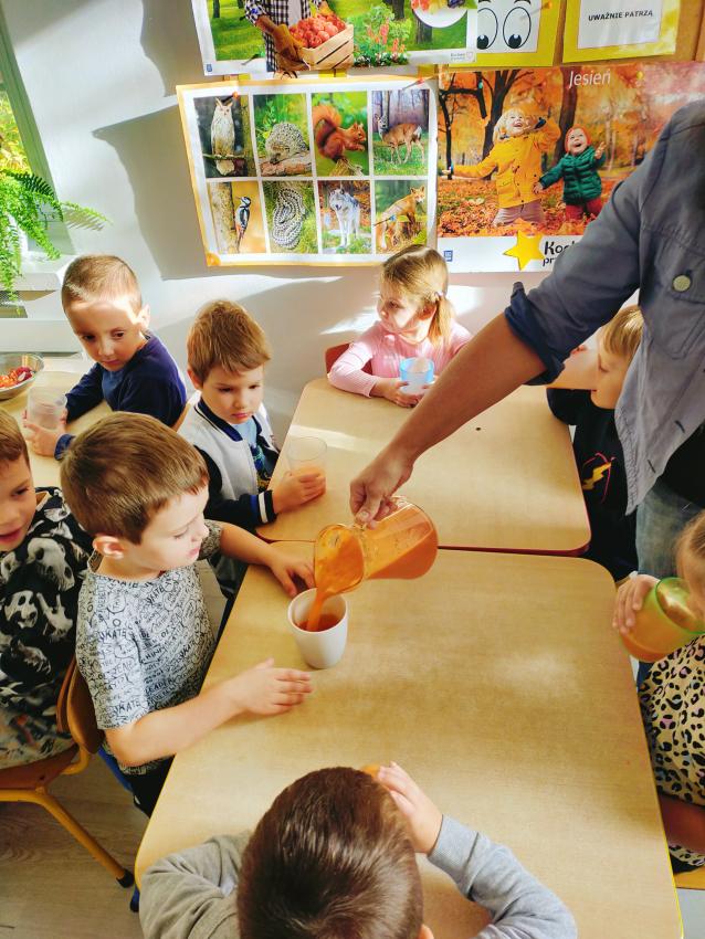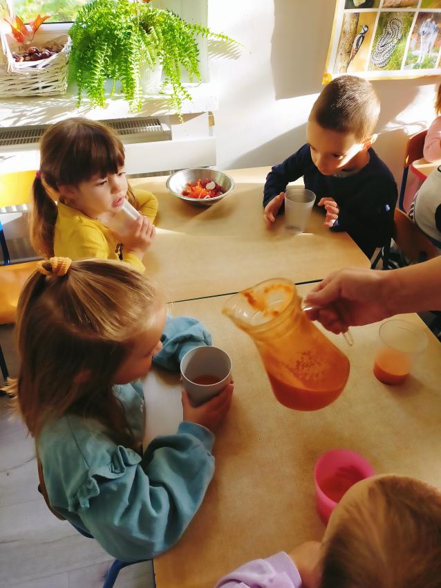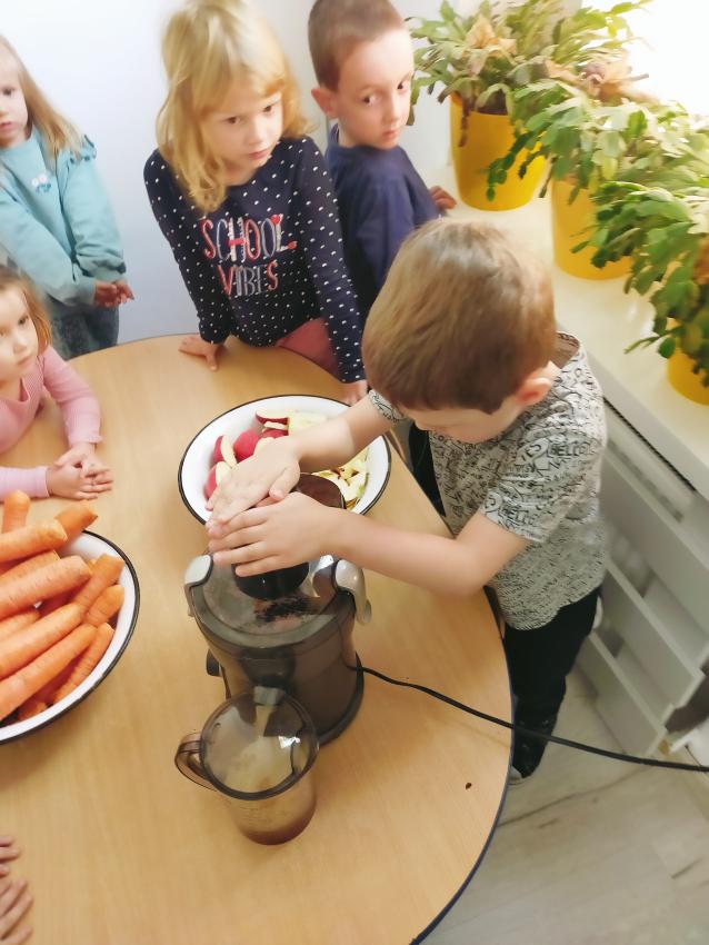 Słoneczka doskonale wiedzą, że sok wyciskany ze świeżych owoców oraz warzyw to  smaczna bomba witaminowa! Dlatego Słoneczka wyciskały sok z  jabłkek i marchewek. Jednak zanim przystąpiły do pracy zapoznały się z urządzeniem do robienia soku ? sokowirówką, jego działaniem i zasadami bezpieczeństwa podczas jej działania. Dzięki zespołowym działaniom praca przebiegła sprawnie i na koniec degustowaliśmy pyszny i zdrowy sok. Był smaczny!