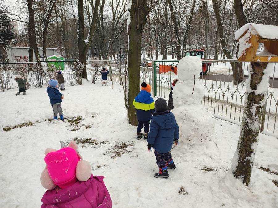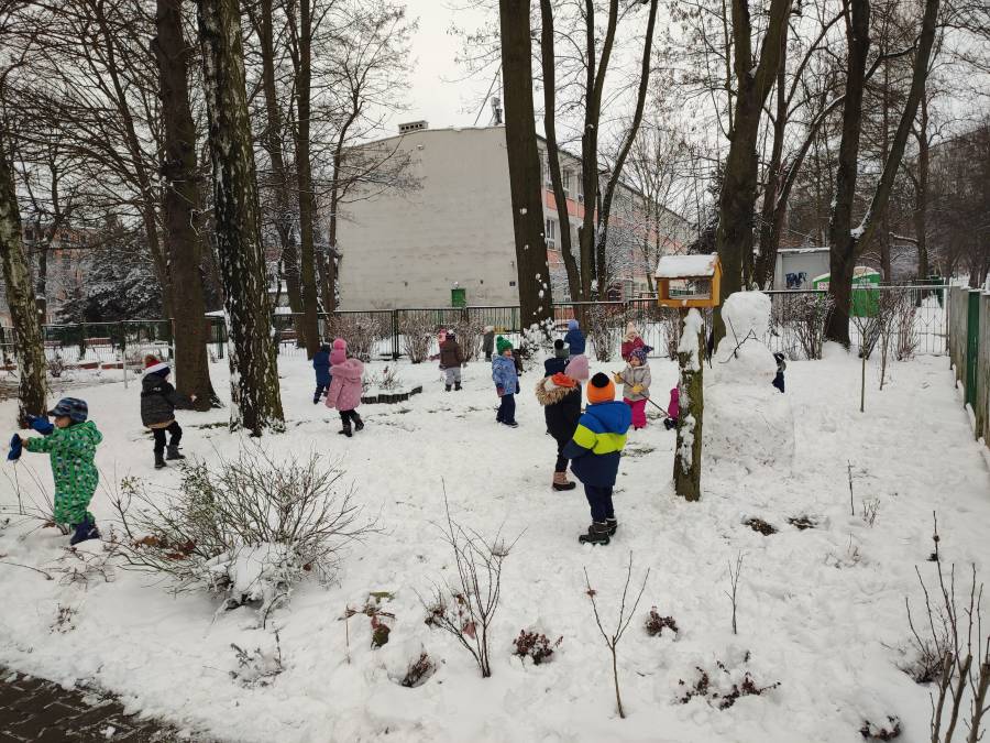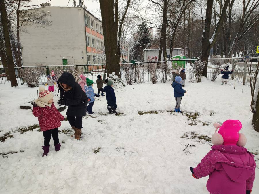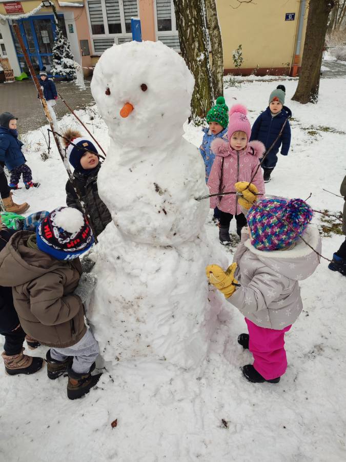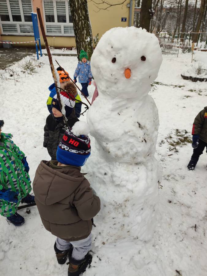 No cóż nie mogło być inaczej. Kto nie kocha śnieżnego puchu, który się dodatkowo lepi. Dookoła biało i my w akcji. Dotykaliśmy, kleiliśmy, co poniektórzy rzucali ulepionymi wytworami :) w drzewo i najważniejsze utoczyliśmy trzy kule, połączyliśmy je i uzbroili w atrybuty charakterystyczne dla bałwana z marchewką w roli głównej.. Psssst: troszkę nam zmokły rękawiczki, a Piotrusiowi nawet rączki zmarzły jednak byliśmy zadowoleni bałwiaście. Hu hu ha zima wcale nie jest zła.