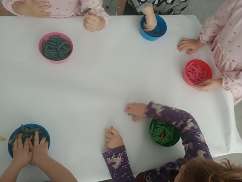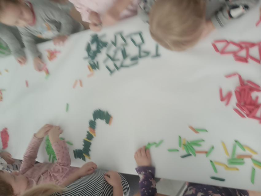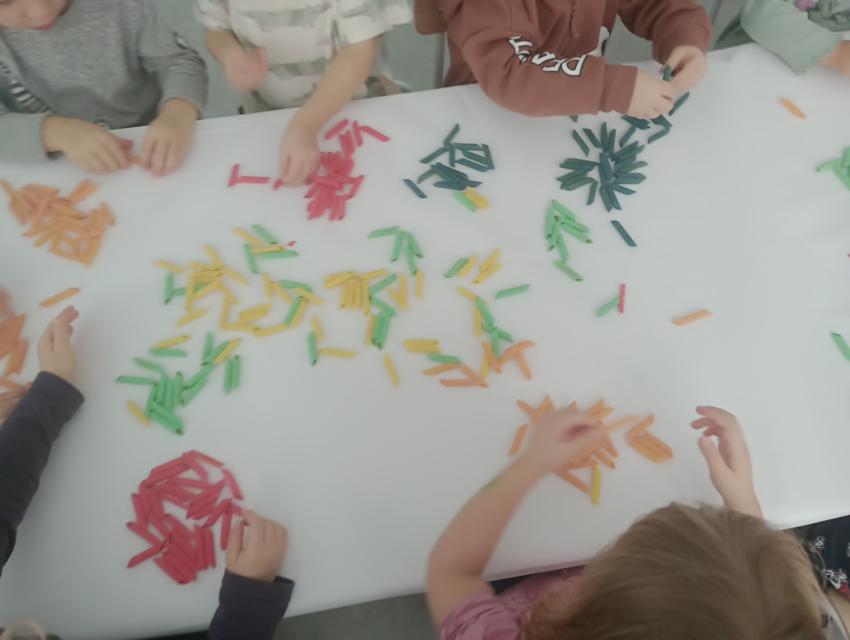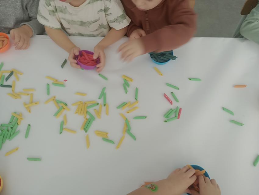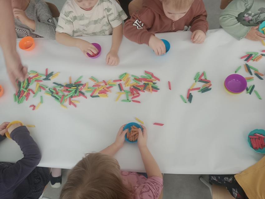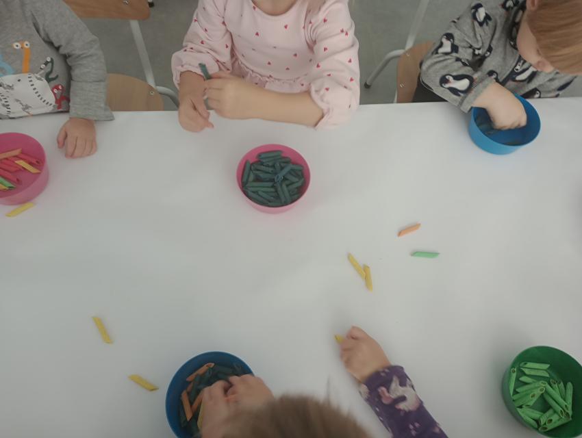 Makaronowe zabawy dostarczyły przedszkolakom mnóstwo radości i wrażeń! Koniczynki mogły doświadczać różnorodnych faktur, kształtów i barw, rozwijając przy tym zmysły wzroku i dotyku. Dzieci chętnie segregowały makaron, dopasowywały kolory i przeliczały jego ilość w kubeczkach, ćwicząc spostrzegawczość oraz umiejętności matematyczne.