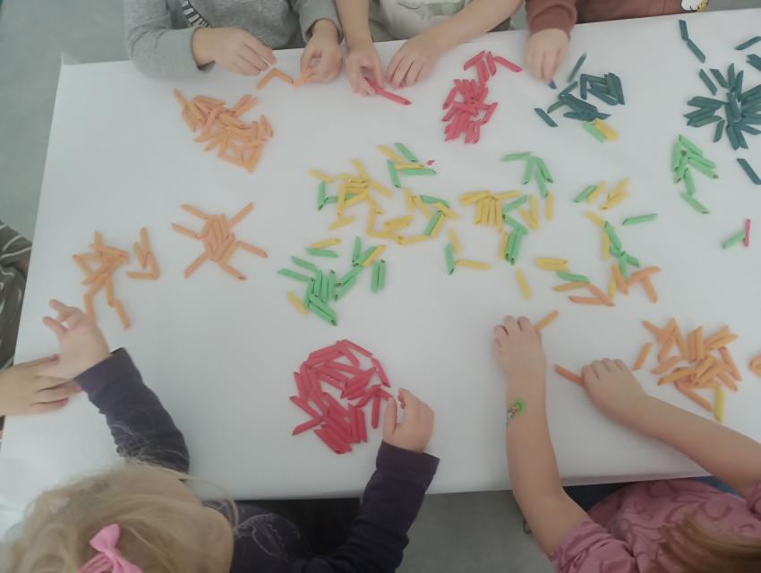 Tego dnia w grupie Koniczynek królował makaron! Dzieci z zaciekawieniem poznawały jego różne rodzaje, a następnie barwiły go kolorowymi farbami, tworząc z niego niezwykłe budowle. Podczas zajęć rozmawiały też o tym, jakie pyszne potrawy można przygotować z makaronu ? od zup po kolorowe sałatki.