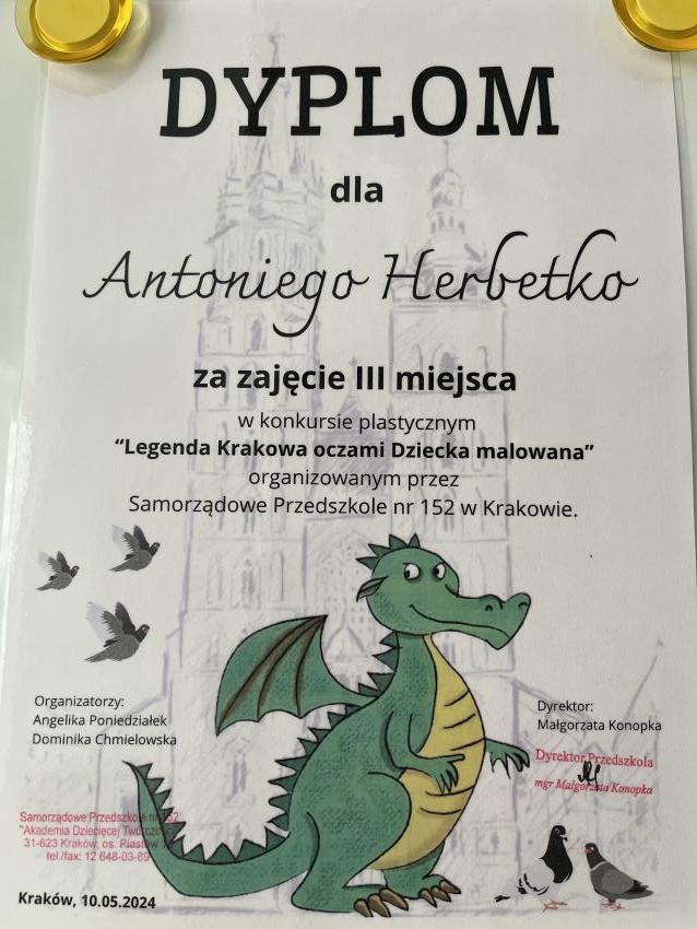 Miło nam poinformować, że Antoś z grupy Pszczółki zdobył III miejsce w konkursie plastycznym p.t. Legenda Krakowa oczami Dziecka malowana organizowanym przez Samorządowe Przedszkole nr 152 w Krakowie. Gratulujemy i życzymy kolejnych sukcesów!