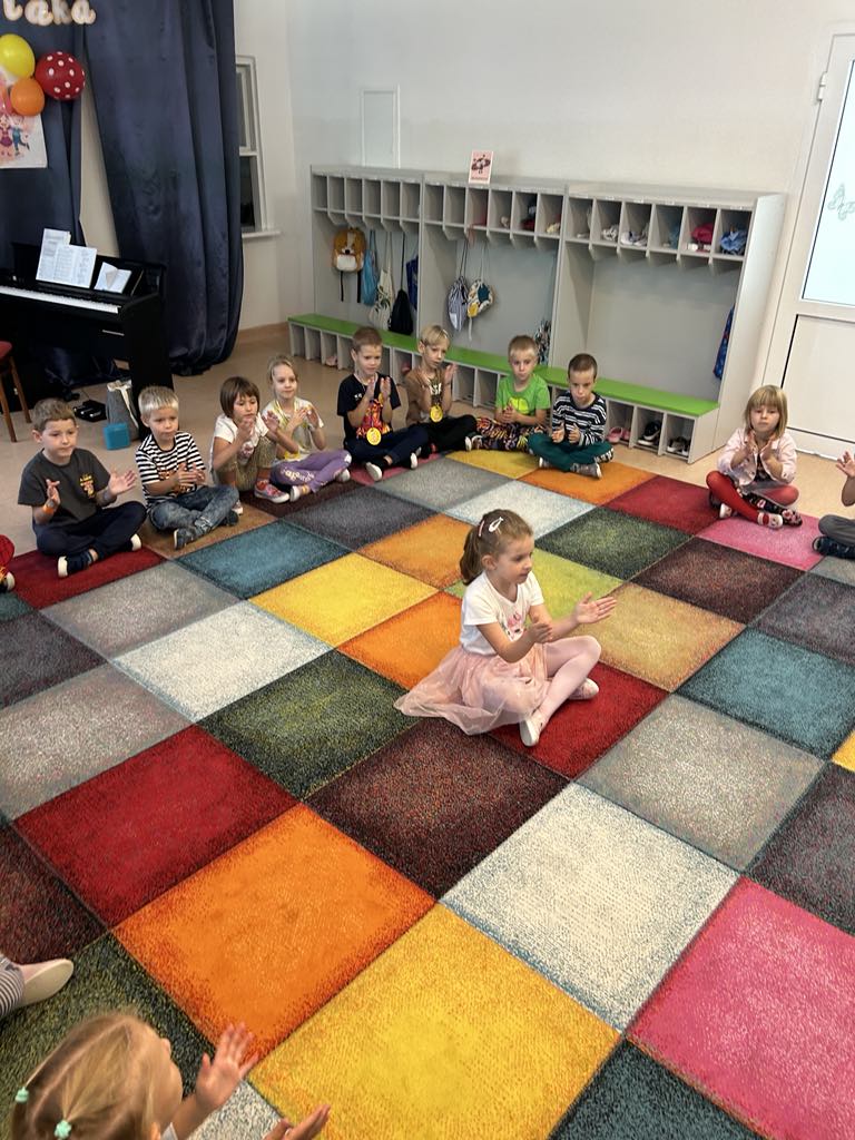 Dzień rozpoczęliśmy od porcji ruchu. Przeprowadziliśmy zabawy ruchowe, zręcznościowe i orientacyjne, podczas których Gwiazdeczki zwinnie pokonywały przeszkody i wykazały  się niezwykłym sprytem. Każdy uczestnik otrzymał pamiątkowy medal przedszkolaka.
