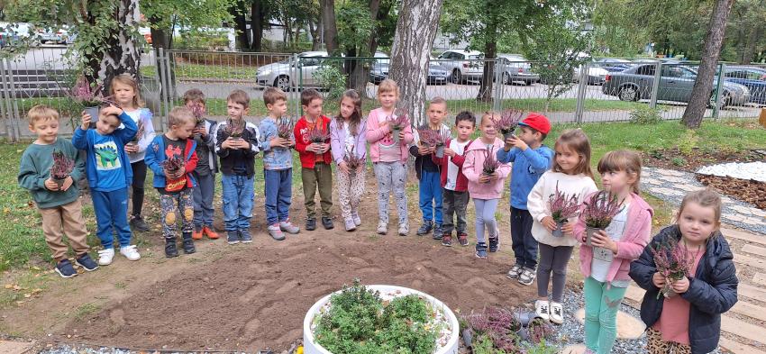 Słoneczka wzięły udział w akcji KWIATY ZA ELEKTROGRATY. Elektrograty  zamieniliśmy w sklepie CASTORAMA na wrzosy, które dzieci zasadziły przy ścieżce sensorycznej.