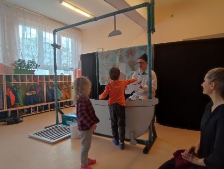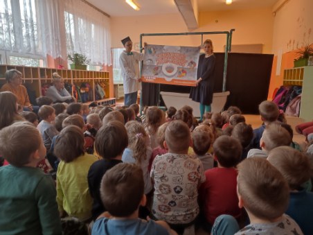 Wyprawa Batyskafem. Misja Skratek - to pełne humoru przedstawienie zaprezentowali nam wspaniali aktorzy współpracujący z Wodociągami Miasta Krakowa. Nasze przedszkolaki patrzyły jak zaczarowane na przygody Dziadka Tadka i wnuczka Olka oraz Smoka Wawelskiego, który  utknął w podwawelskich lochach i przedostał się do miejskich kanałów. Co kryją kanały i dlaczego Smok nie może się z nich wydostać? Dzieci z zapartym tchem śledziły akcję by poznać rozwiązanie tej eko-zagadki!