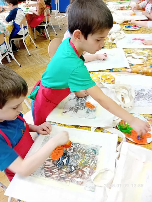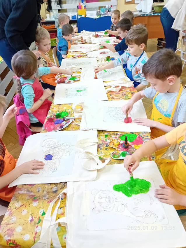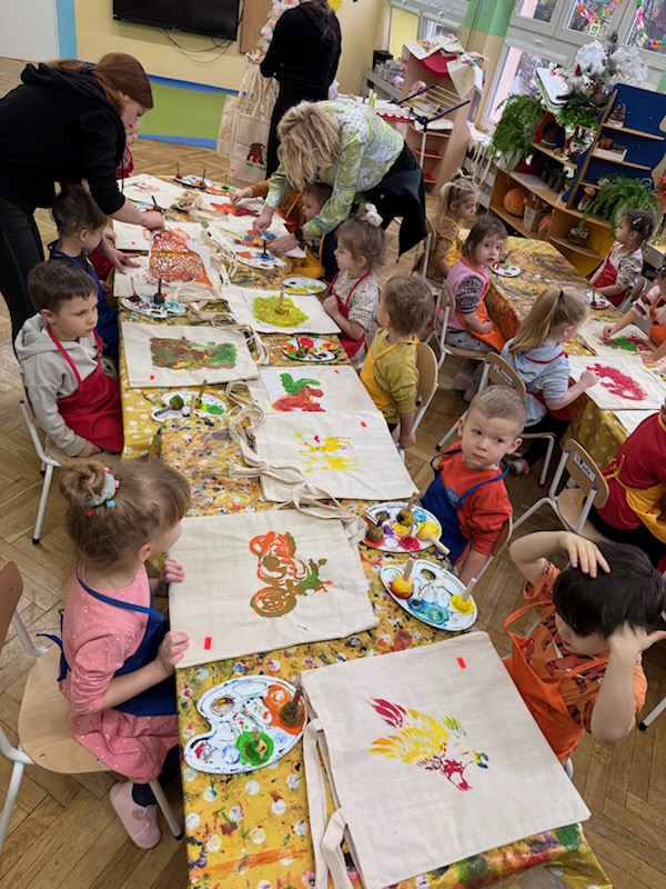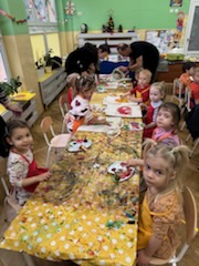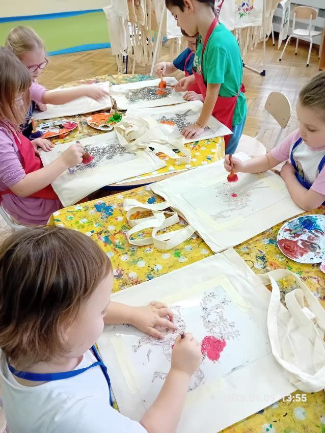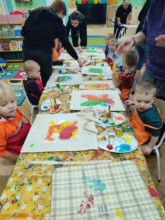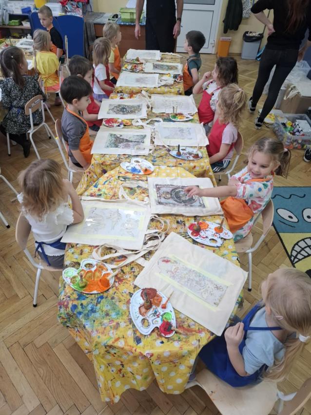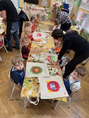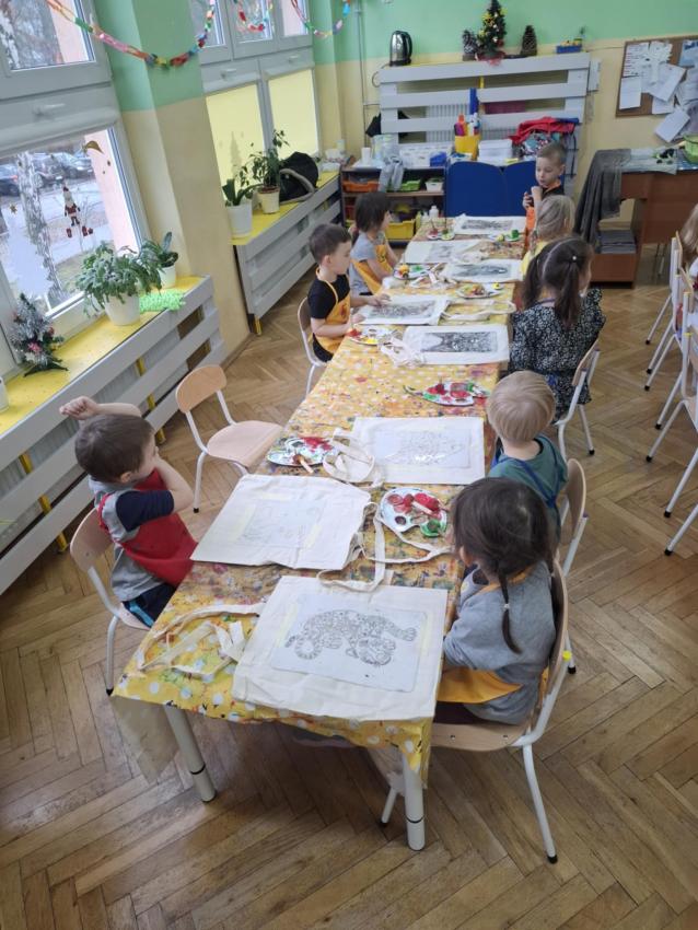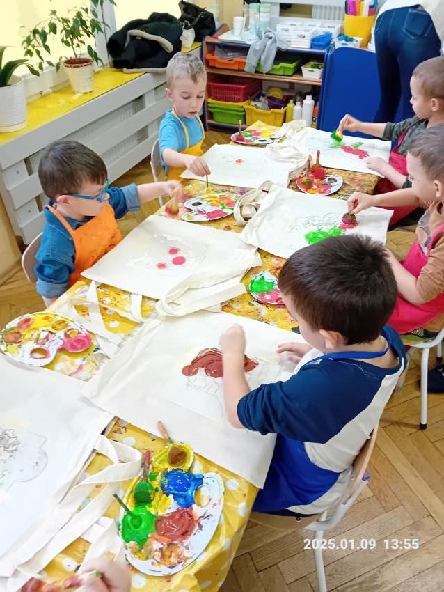 Dzieci z wszystkich grup wzięły udział w warsztatach malowania siatek, którymi obdarują swoje Babcie i Dziadków z okazji ich święta.