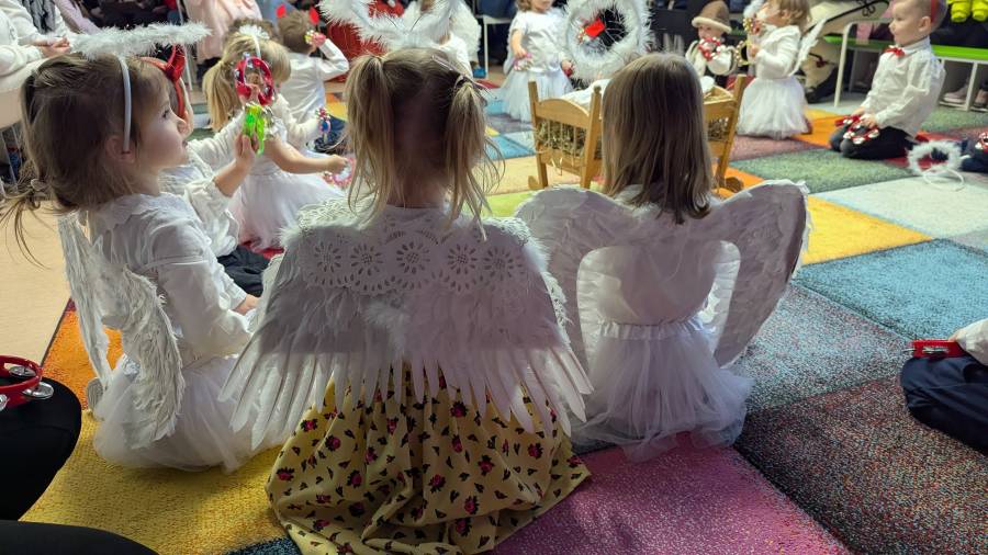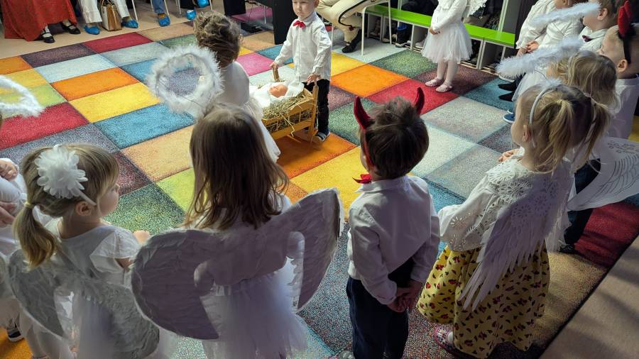 z wielkim wyczuciem wykonały układ taneczno-ruchowy. W pięknych strojach przedstawiły symbol narodzin Dzieciątka Jezus, oprawioną kolędami i pastorałkami, a także ku wielkiemu zaskoczeniu widzów było piękne , niesione światło przez nasze dzieci. Na twarzach rodziców malowało się zadowolenie i wzruszenie?